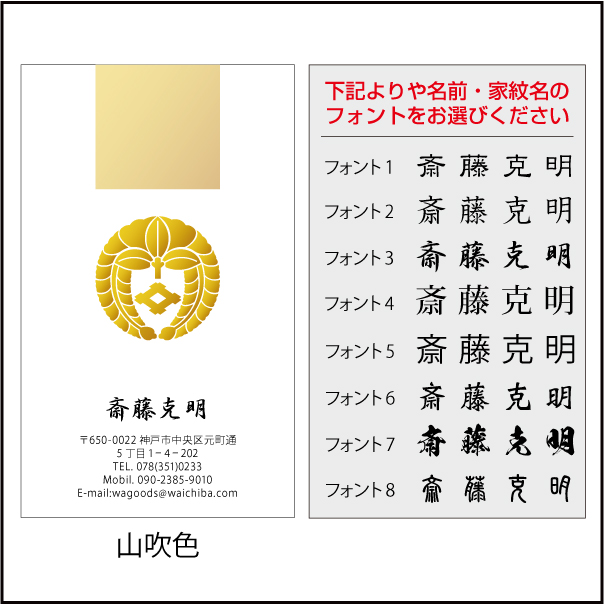 この名刺をお持ちのあなたはもちろんのこと手渡されたお相手も、日本の誇るべき家紋を身近に感じていただけるのではないでしょうか。名刺として、カードとして様々なシーンでご活用頂けましたら幸いです。印刷色は9種類のカラーパターンを、フォントは8タイプをご用意いたしました。